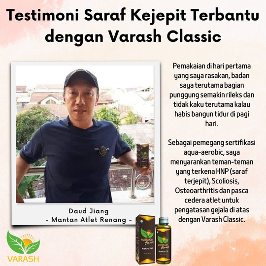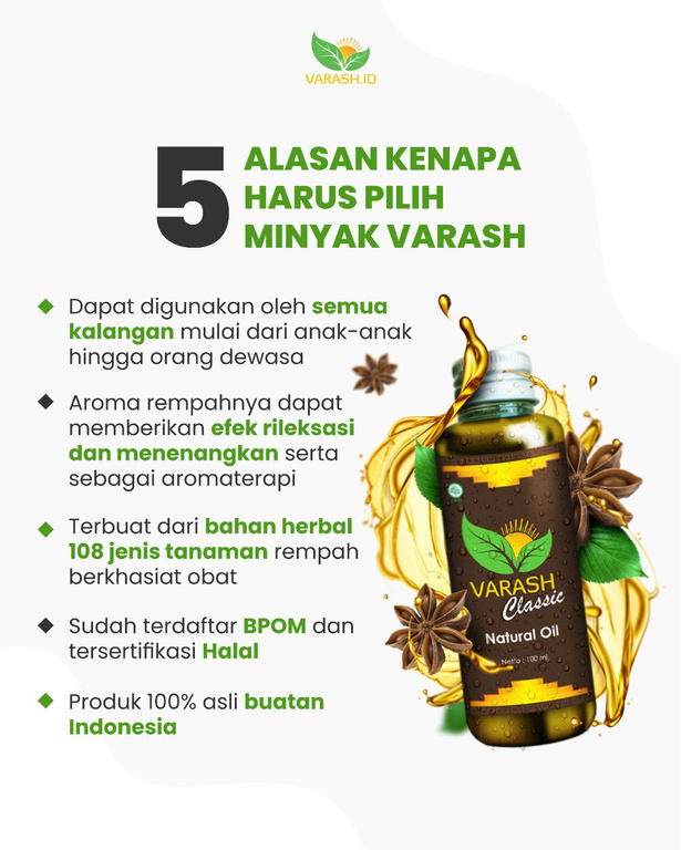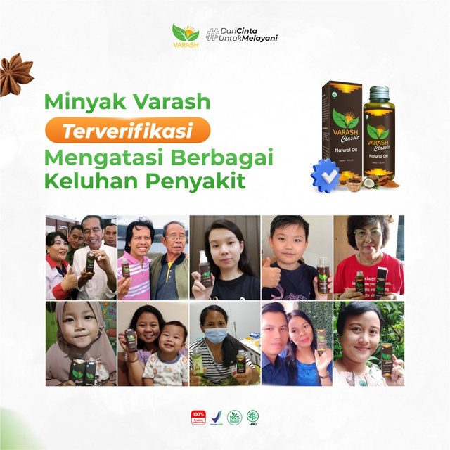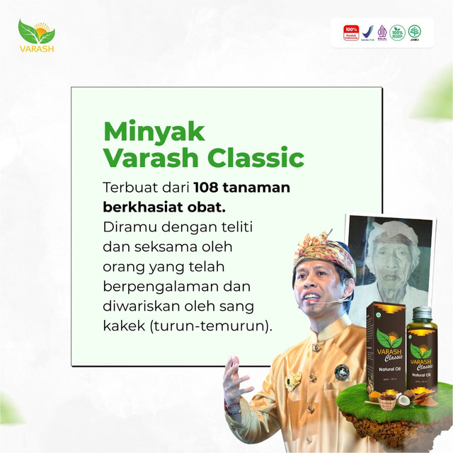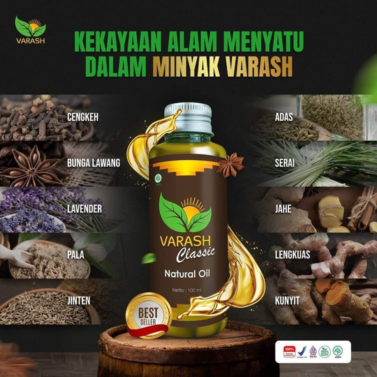 Varash Classic Natural Oil merupakan saripati Varash Natural Oil yang dapat membantu mengatasi berbagai keluhan penyakit menahun, dadakan, penyakit yang tidak jelas penyebabnya, dan keluhan psikosomatis.